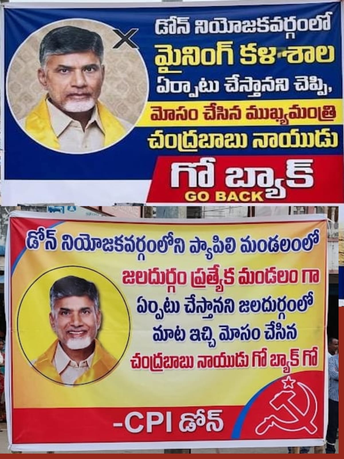 డోన్, న్యూస్ వెలుగు; నియోజకవర్గ ప్రజలను మరోసారి మోసం చేయడానికి వస్తున్న ఆంధ్రప్రదేశ్ ముఖ్యమంత్రి చంద్రబాబు నాయుడు పర్యటన వ్యతిరేకించాలని డోన్ నియోజకవర్గ పజలకు సిపిఐ పార్టీ డిమాండ్ చేసింది. 2014 ఆగస్టు 15న కొండారెడ్డి బురుజు సాక్షిగా జాతీయ జెండా ఆవిష్కరణలో డోన్ లో జాతీయ మైనింగ్ కళాశాలగా ఏర్పాటు చేస్తారని హామీ ఇచ్చి మోసం చేసిన చంద్రబాబుడోన్ నియోజకవర్గాన్ని కర్నూలు జిల్లాలో కలుపుతానని హామీ ఇచ్చి ఓట్లు వేయించుకొని అధికారంలోకి వచ్చిన తరువాత మోసం చేసిన చంద్రబాబు గారు గో బ్యాక్ గో బ్యాక్ డోన్ నియోజకవర్గంలోని ప్యాపిలి మండలంలో జలదుర్గం ప్రత్యేక మండలం గా ఏర్పాటు చేస్తానని జలదుర్గంలో మాట ఇచ్చి మోసం చేసిన చంద్రబాబు నాయుడు డోను, పత్తికొండ నియోజకవర్గం హంద్రీనీవా కాలువ ద్వారా 94 చెరువుల నింపుతానని మోసం చేసిన మోసం చేస్తున్నార న్నారు.